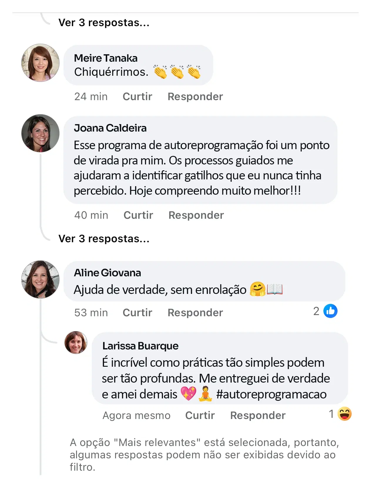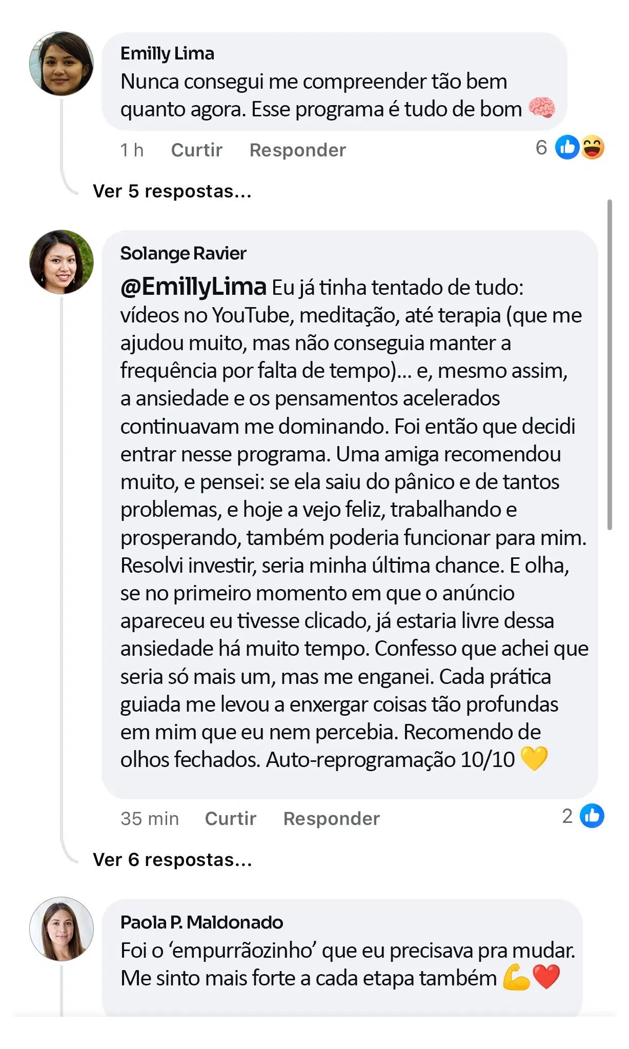O Auto-Reprogramação não é um curso. É um caminho seguro e guiado para você realizar sua própria terapia e conquistar uma vida mais livre, confiante e plena.