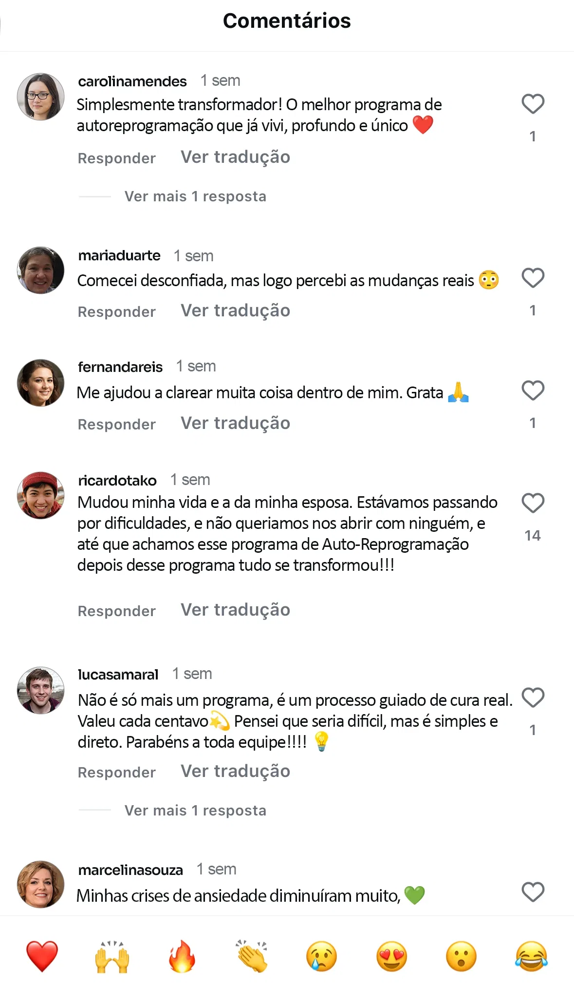 Com o AUTO-REPROGRAMAÇÃO você irá romper crenças, traumas, padrões e bloqueios emocionais através de uma sequência de áudios hipnóticos que já transformou a vida de mais de 50 mil pessoas.
